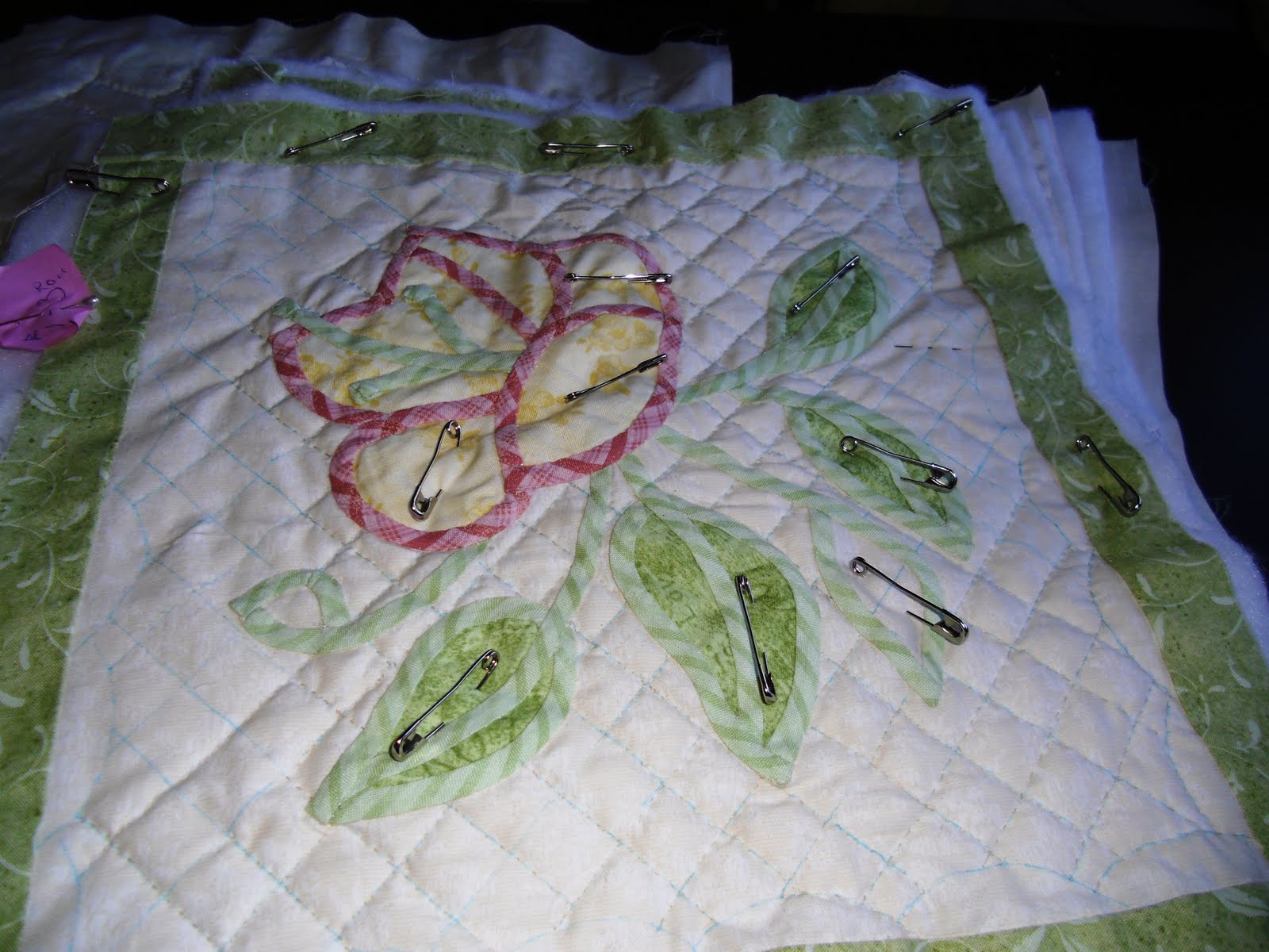While we were at the class Margaret was working busily on her sampler quilt. The combinations of the pink and green Nancy Halvorsen fabrics look lovely.